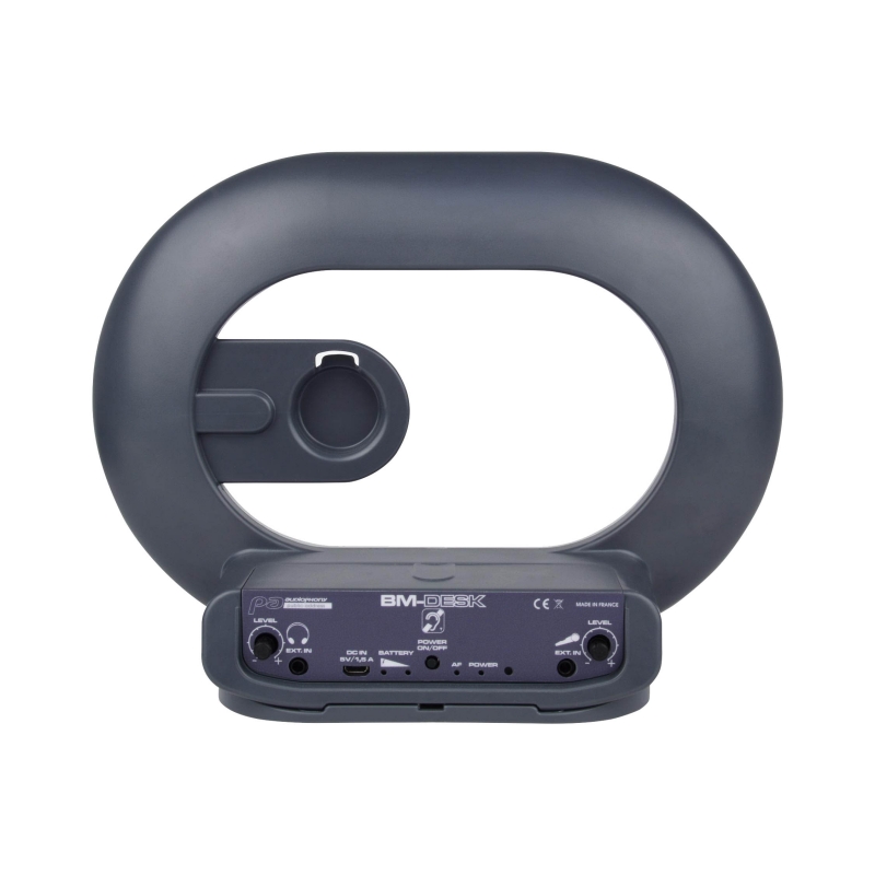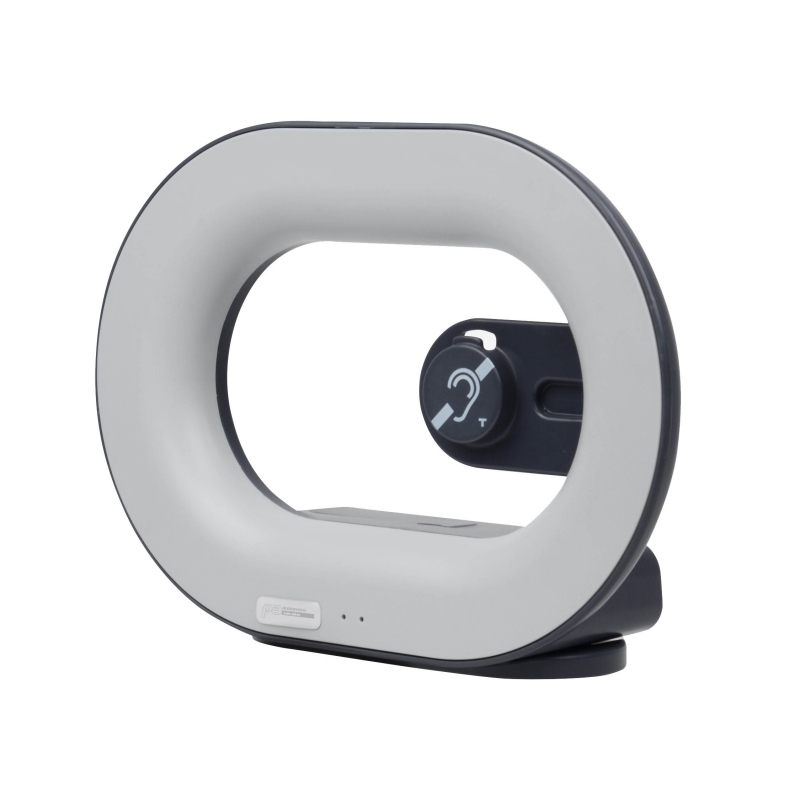 Fabricado en ABS, integra un micrófono, un amplificador, una batería recargable y un bucle de inducción para una