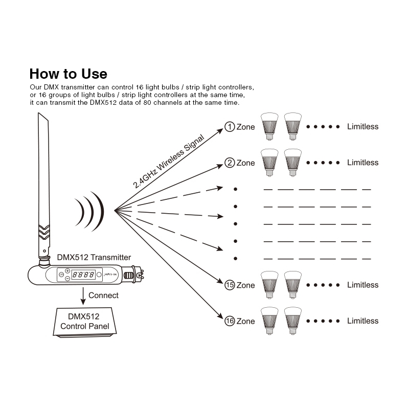 Nuestro transmisor DMX puede controlar 16 bombillas / controladores de tira led, o 16 grupos de bombillas / controladores de tiras