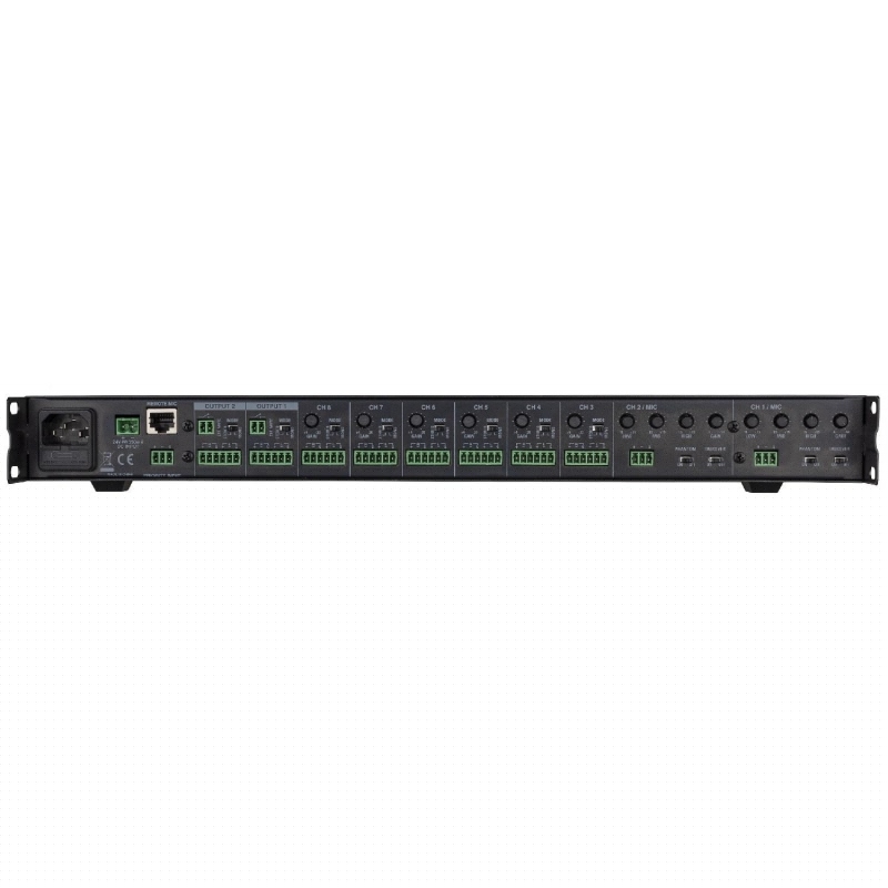• El MX82 tiene 2 salidas equipadas con un ecualizador de 2 bandas y control de nivel independiente