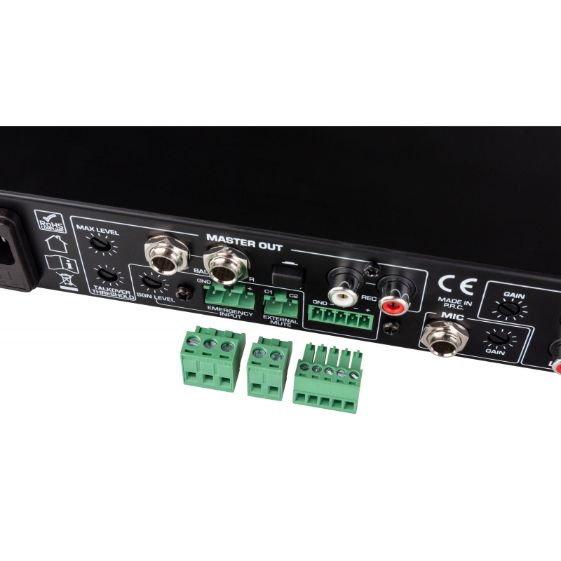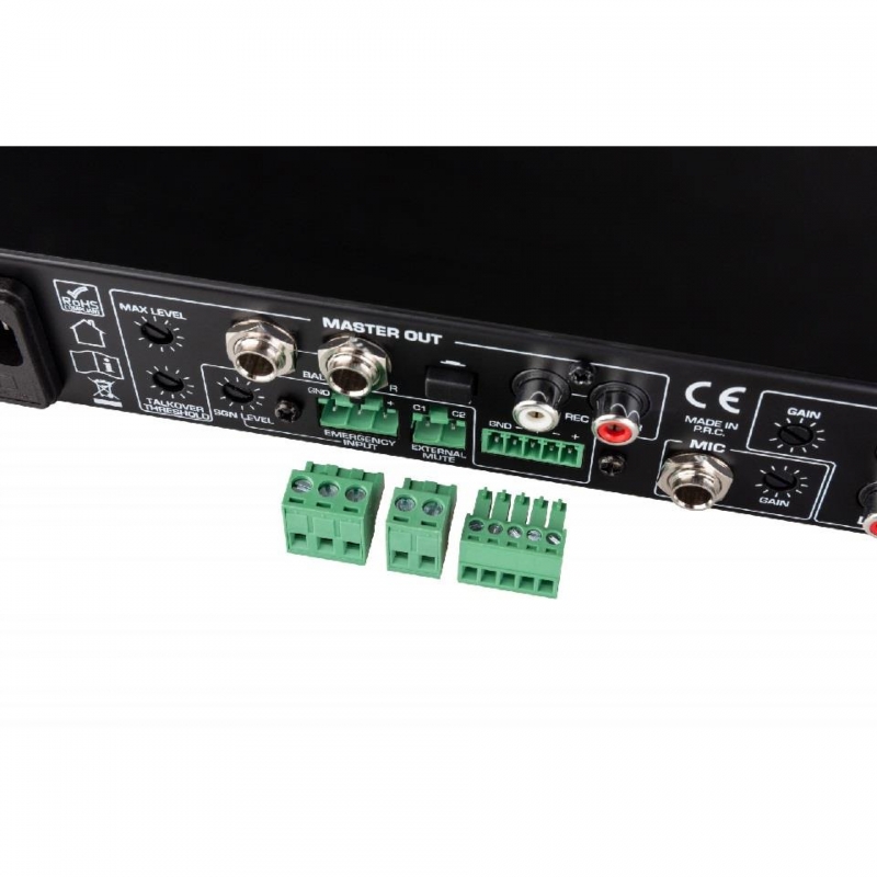 • Entrada de mensajes de emergencia (conector Euroblock) con silenciamiento automático de audio