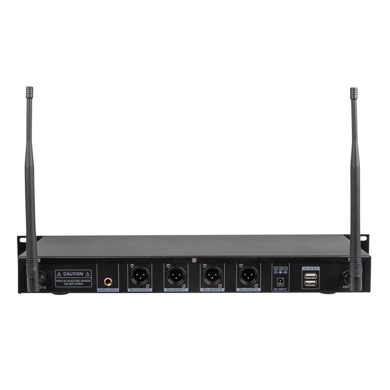 - 4 receptores de micrófono inalámbrico PLL/UHF separados en una carcasa de rack de 19"/1U!