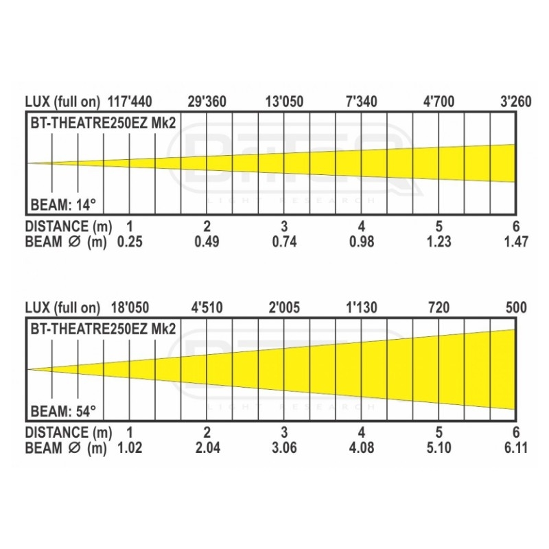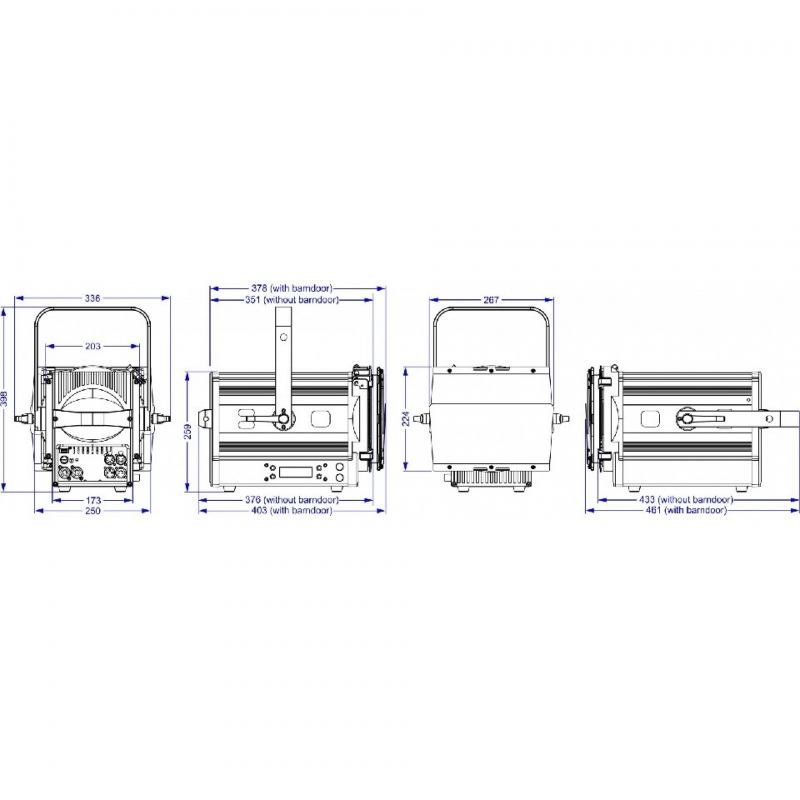 • LED 3200K blanco cálido de 250W que produce una salida de luz que supera a los focos de teatro halógenos de 2kW