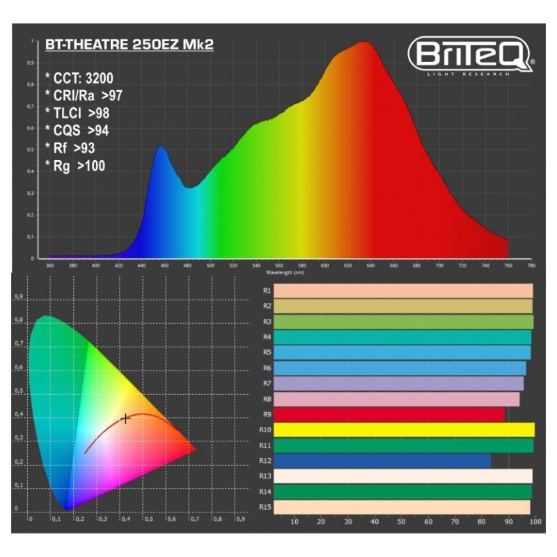 • Excelentes características fotométricas: CRI / Ra> 97, TLCI> 98, CQS> 94, Rf> 93, Rg> 100