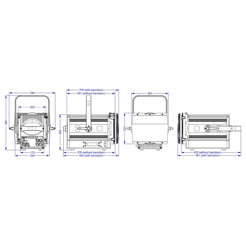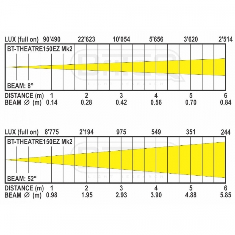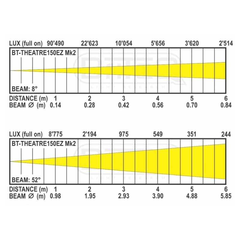 • LED 3200K blanco cálido de 150W que produce una salida de luz que supera a los focos de teatro halógenos de 1kW