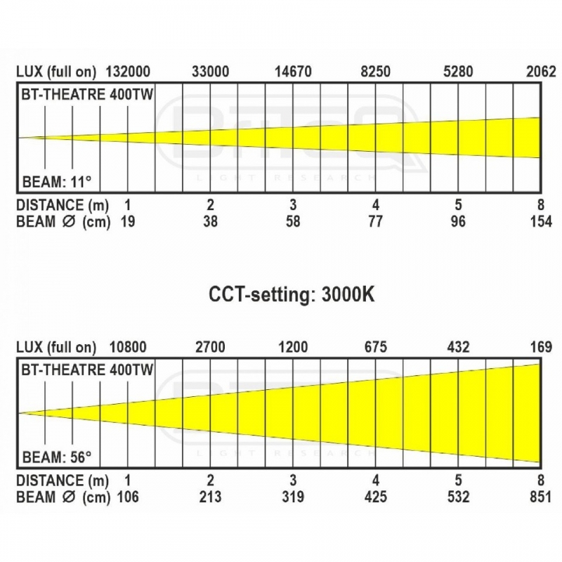 • LED doble (200W 2800K + 200W 6000K) para blanco sintonizable con CCT que va desde 2800K a 6000K