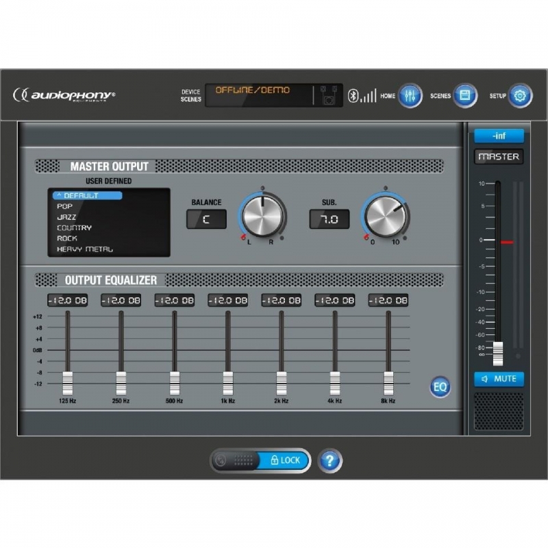 - Ecualizador de salida gráfica, master, balance, nivel SUB
